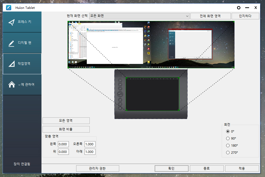 한쪽으로만 설정도 되고 듀얼모니터를 한개의 모니터 처럼 쓸수도 있고, 이때 그림그리면 불편하니 마우스모드를 활성화 하면 영역(좌표)에 구애받지 않고 자유롭게 그릴수 있다.
